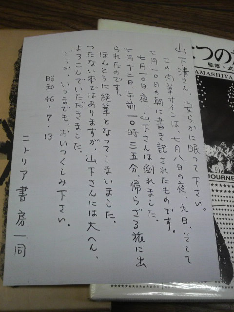 【山下清さん、安らかに眠ってください。この肉筆サインは、七月八日の夜、九日、そして七月十日の朝に書き記されたものです。七月十日夜、山下さんは倒れました。七月十二日、午前10時35分、帰らざる旅に出られたのです。ほんとうに絶筆となってしまいました。つたない本ではありますが、山下さんには大へん、よろこんでいただきました。どうか、いつまでも、おいつくしみ下さい。